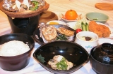 的矢かき御膳「いそべ」 ¥4,100要予約「セット内容」焼きかき・かきフライ・酢かき・かき茶碗蒸し・かき陶板鍋・果物・漬物・吸物